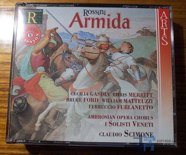 armida中用了7位男高音角色构成了梦幻的骑士世界,当然演出中由3位男高音来演出,因为7个人不会同时在场(另外一个是龙套)。这里用了80年代最杰出的3位罗西尼男高音:merritt,ford和matteuzzi。女主是gasdia,阵容强大,可惜的是唱片公司为了节约成本,做了一些删节。