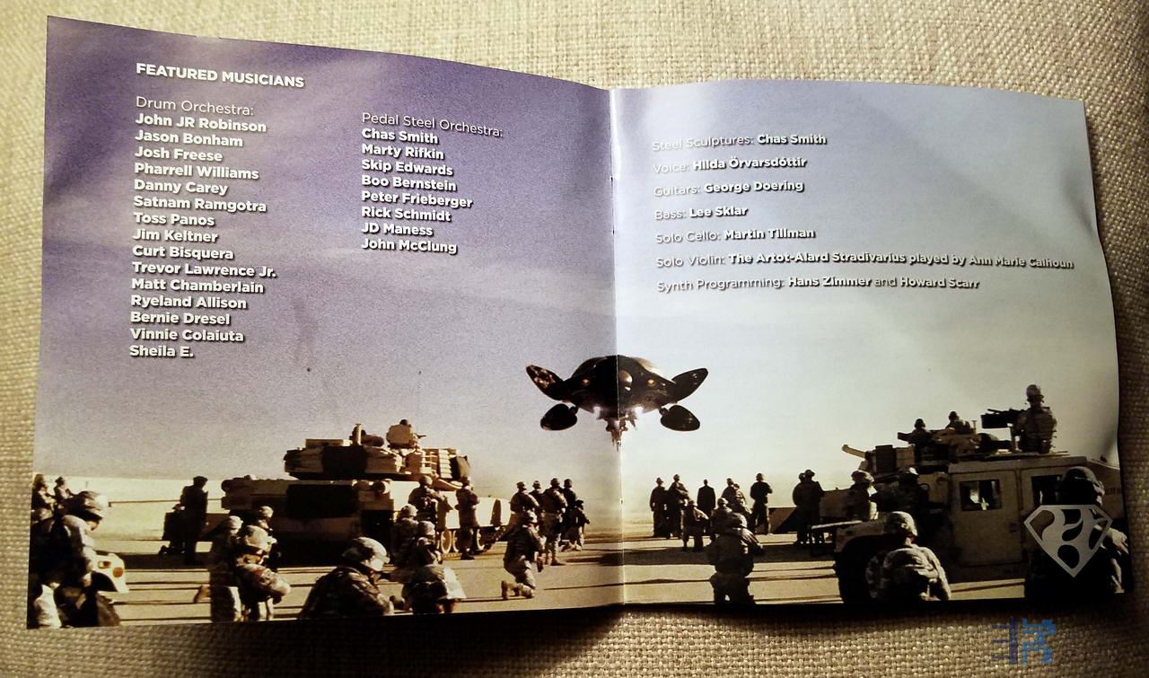MEN OF STEEL(超人·钢铁之躯)这张电影原声大碟阵容强大,从封套内页介绍来看,光是世界顶级的鼓手就有10多个,而且是Hans Zimmer指挥10个鼓手同时演奏,现场录制的。