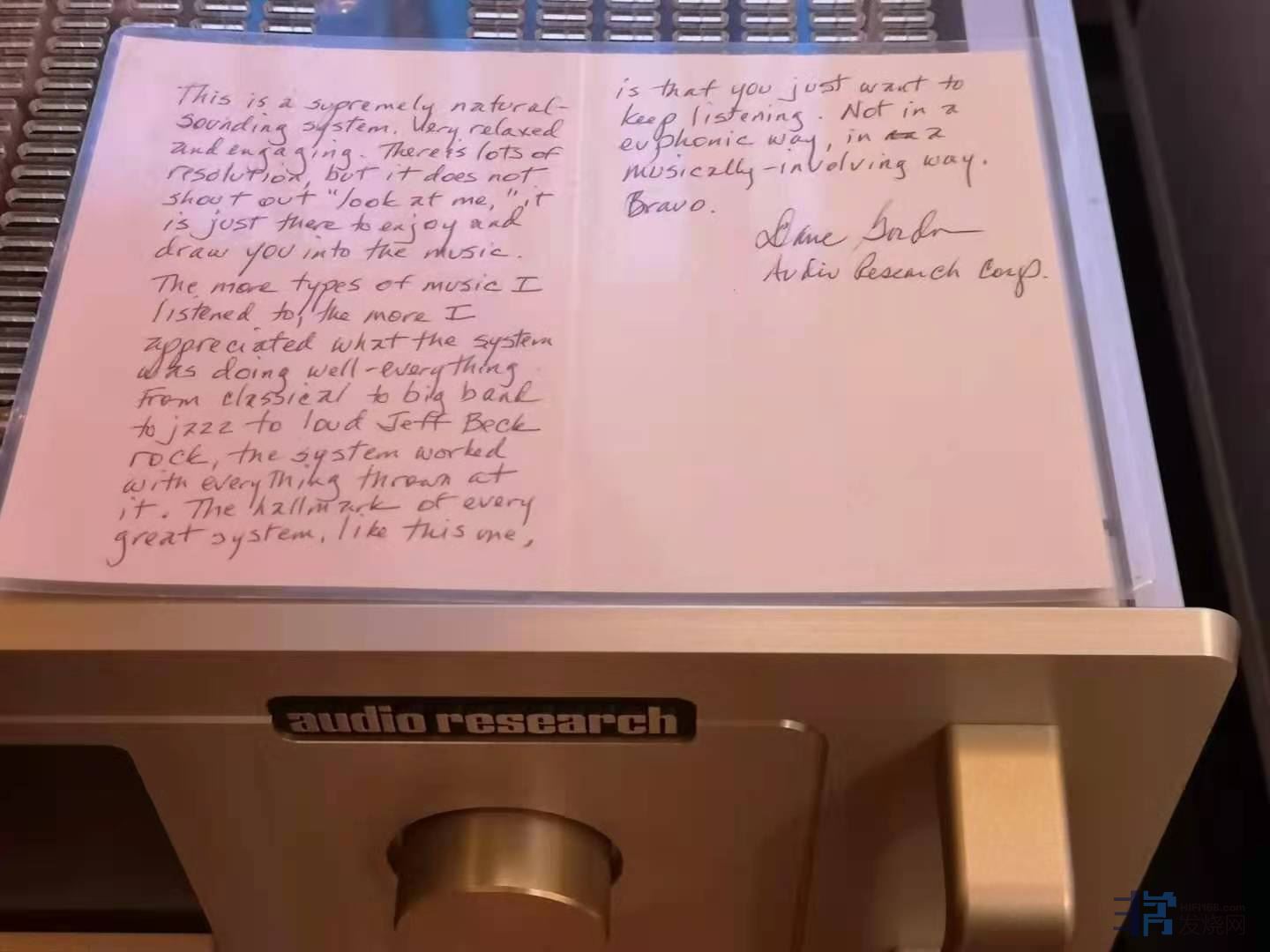 邝大侠的府上访客无数,他最引以为傲的就是美国AUDIO RESEARCH CORP公司主管兼技术顾问到访后,即場写下的评语,以下是邝大侠所作的介绍,英文翻译由小弟代勞,如不到位,勿怪!