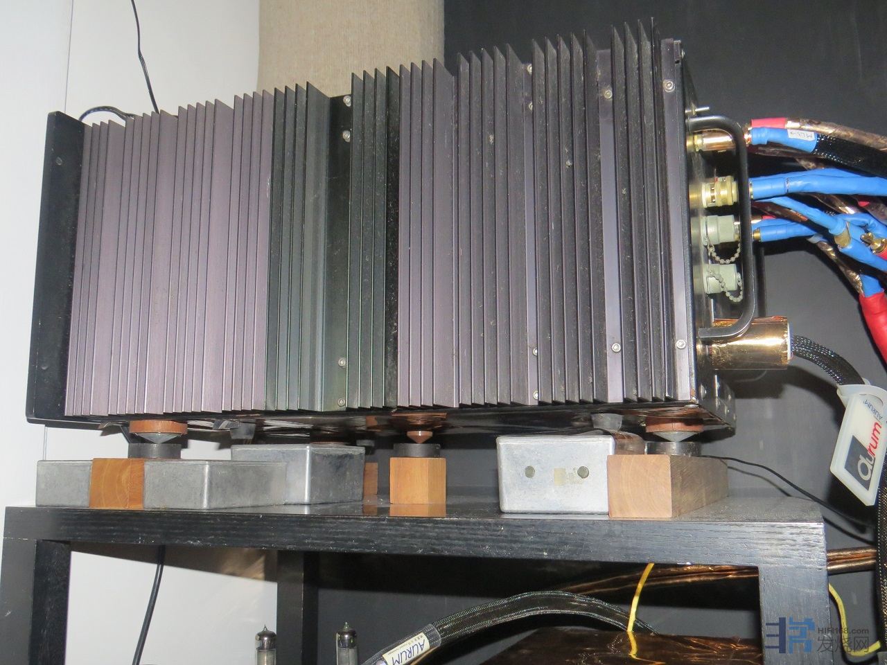 又以下图Mark Levinson ML3后级为例,在机底正中间位置,多用上一枚紫金钉及/或音响子弹木垫(黑色的就是音响子弹系列产品),和其他紫金钉及音响子弹木方配合,机底正中间的配置,和仙乐音箱箱底正中间第5只脚钉的效果雷同,更有画龙点睛的作用。