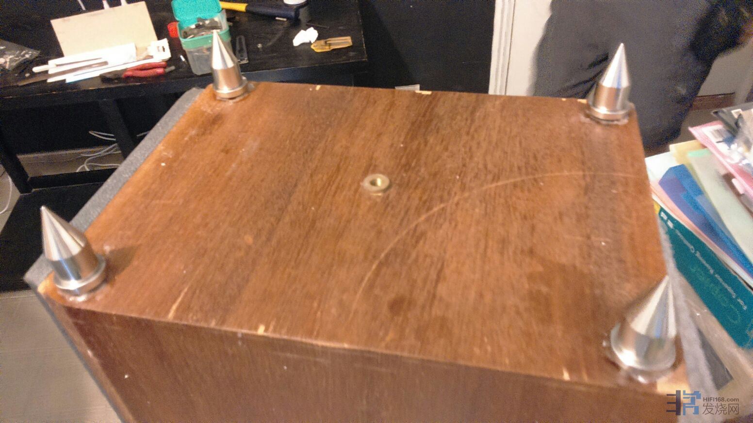 我们当然有用紫金钉调整音箱音色,而且是必用,请参看附图,这是我20多年前设计的仙乐座地音箱之一,在箱底正中间的第5只脚钉,是仙乐座地音箱的独有设计特点之一,也是共振最强的位置,在这经常被烧友和设计师忽略的位置加钉,可以强化音箱的控制力、声音密度、余音残响和力水等,在这位置再用上一枚紫金钉或紫金钉垫(音响子弹系列产品亦可),中音、人声和弦乐的音色可以有进一步的明显改善,尤其是在音乐感和起承转折之间的流畅度方面,效果更大。