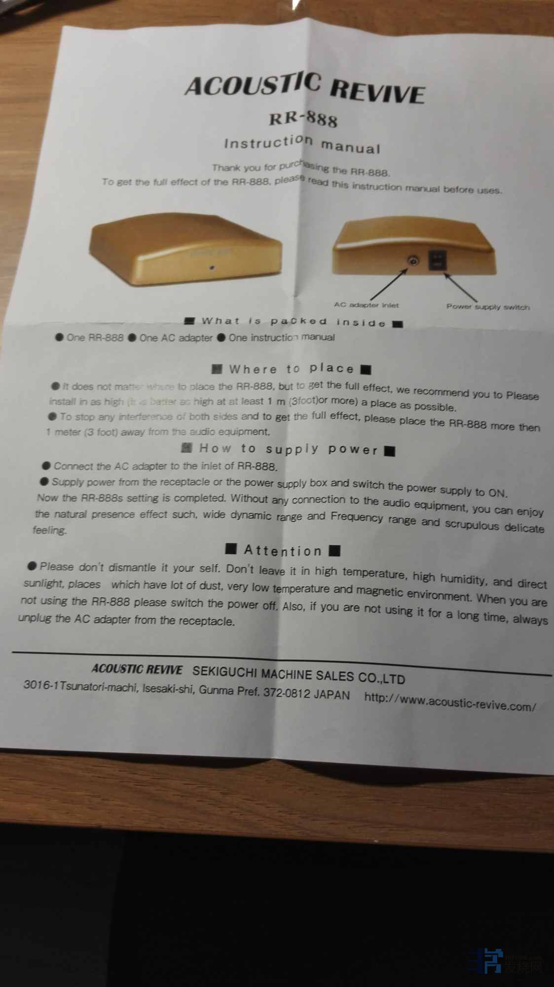 不过,有人曾提出,舒曼波这种极低频电磁波就相当于天地之“气”,网上搜索下来,关于舒曼波类的健康类产品还真是不少:手环,水处理器等物件均声称能对人体健康产生极其正面的效果。而在音响界,竟然也有此类“神器”,而且出品多年,已经发展到了第三代产品!这就是日本acoustic revive(音神)的RR888极低频发生器,它能持续的发出7.83hz的极低频电磁波(舒曼波),并宣称对音视频都有极佳的改善效果。再仔细搜索了一下,这个DD在国外网站上也有过不错的评价,甚至还获过奖项。