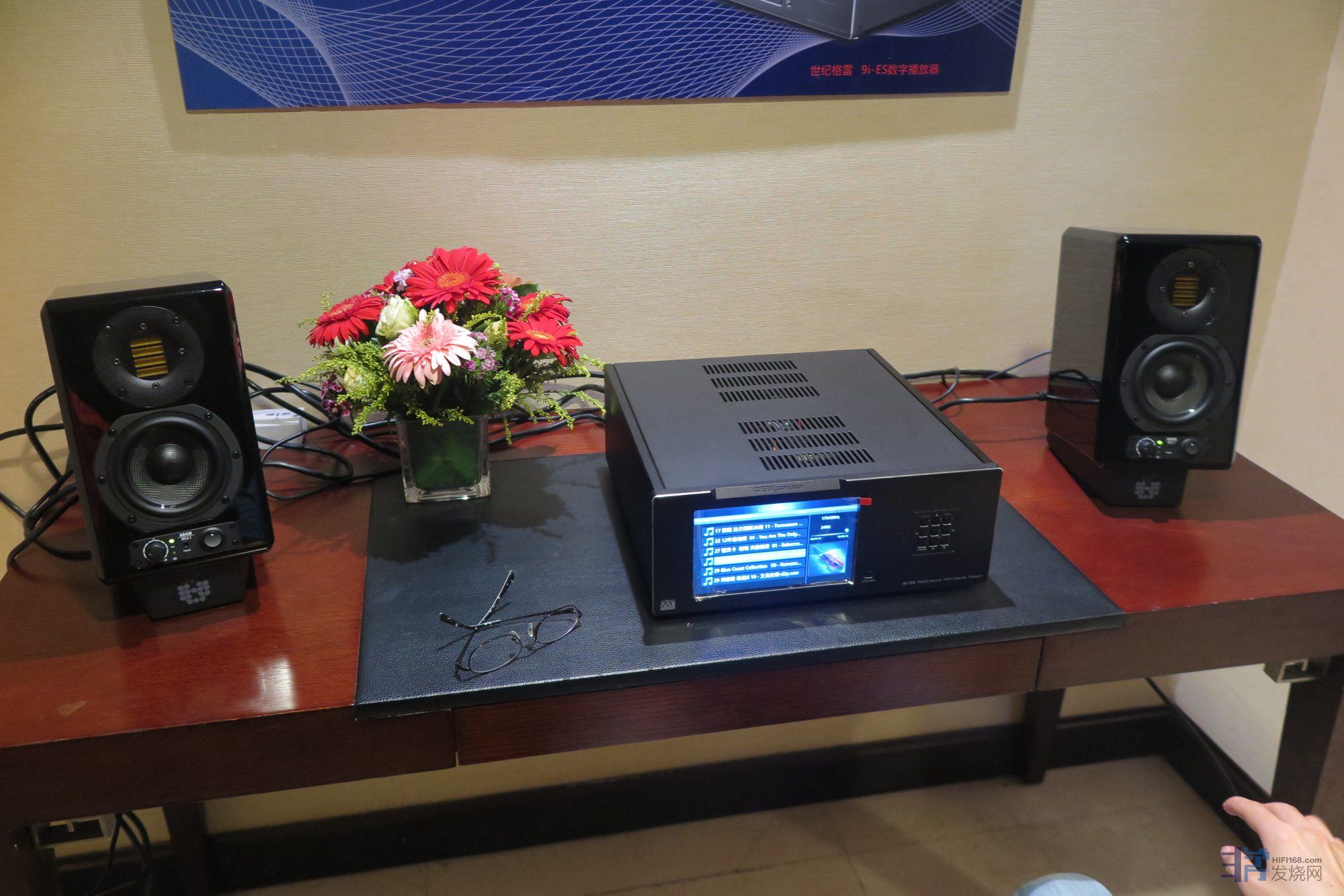 其实在格雷展房我听的时间最长的一套系统不是上一楼里的几套,而是下面图里的这套桌面系统。格雷9I-ES耳机播放器+adam artist3有源4寸书架组成的小型桌面系统。虽然两样东西的尺寸都不大,但听感上却给人以非常健康精神的感受,低频弹性,瞬态张力都非常好,而中高频则呈现出一种带有水润度的鲜活感。中频人声并非致密型,更多呈现出一种密度适中的自然,全频细节都有不错的表现,说实话,这套桌面系统的声音品质已经不是一般桌面系统的声音概念了。高端桌面音响玩家绝对值得一听!