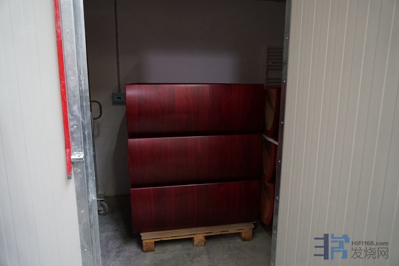上完漆后的木箱会送到图中这个白色大柜里面去,这是一个恒温干燥箱,里面采用恒定38摄氏度设定,所有木箱都要在这里放上30-40天时间,让油漆充分地让木头吸收和风干。