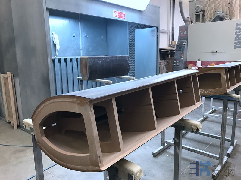 打蜡后的木箱还需要送到另一边密闭的喷漆车间进行封漆处理,木箱来到这里后需要喷上4层清漆把那个光滑如镜的表面保护起来,这样才宣告大功告成。