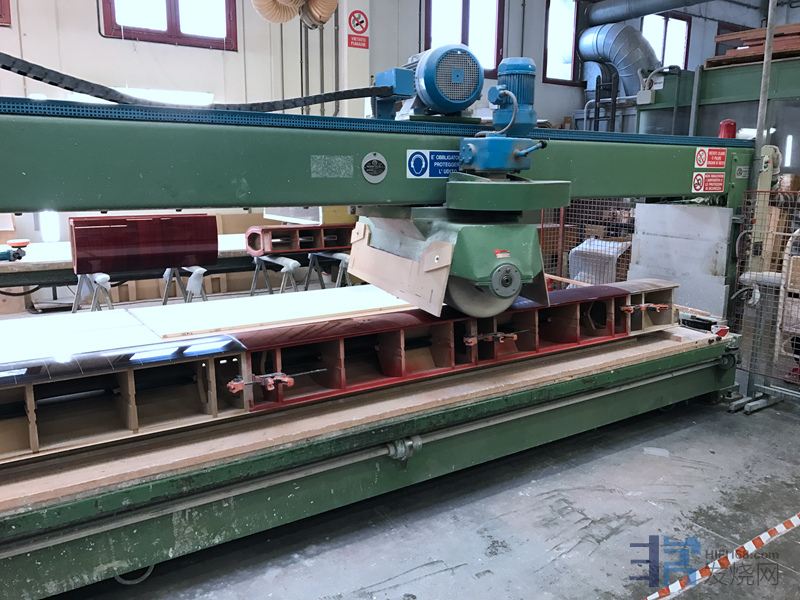 充分干燥后的木箱会送到这里上机打磨抛光,图中工人采用机器砂纸带抛光机在打磨,中途还会换上不同号数的砂纸进行抛光。