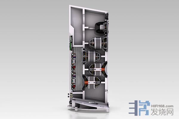 在高音单体之下,9H还有两只被动低音,背面则有两只主动低音,低音单体直径为8.5吋,振膜材质则是他们自家招牌X-PAL铝质振膜。特别的是9H和7H所使用的低音单体,原厂称为Differential Drive磁力系统,它有两组音圈、两组弹波、三倍的磁铁,对于单体控制力更好,失真也更低。也因为这个设计,低音单体的长度很长,几乎是一般单体的两倍。这个双音圈,是以耐高温的铜线(可耐温华氏600度)绕于Kapton的音圈套筒上,两端则各有一个Nomex弹波。背面的两组低音单体则是主动设计,配备了一个双700W的D类功放,分别给予一只低音,换言之,单支Soprano 9H,就内藏了1400W的功放。
