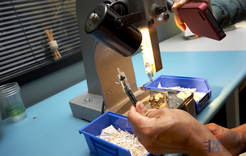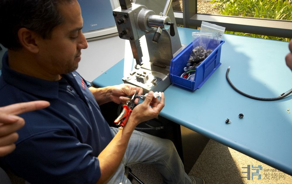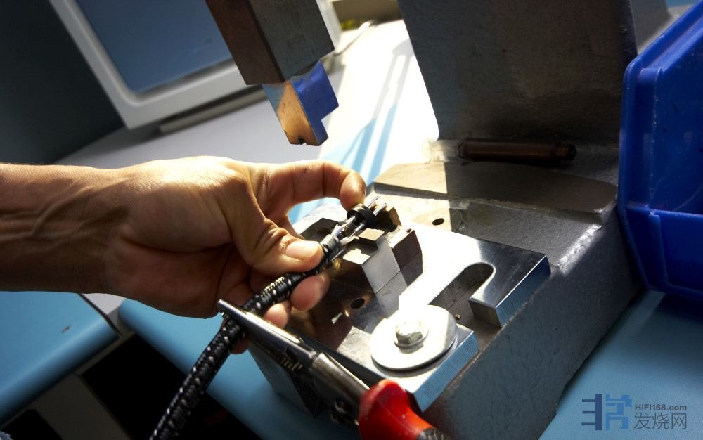 喇叭线拨开之后还要按照规范把线绞好。在工作台上可以看到拨多长都是有尺度的,完全按照规范来,