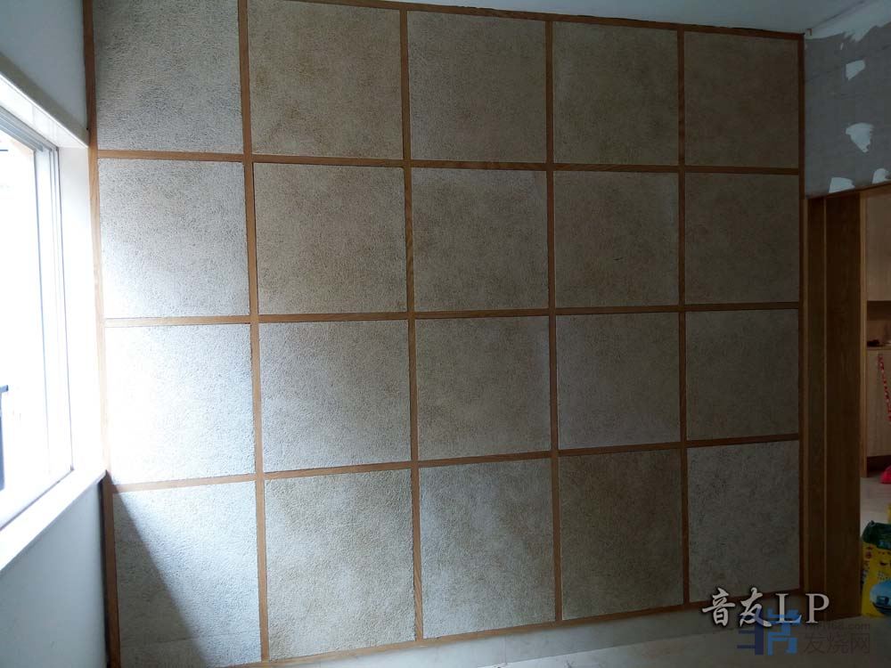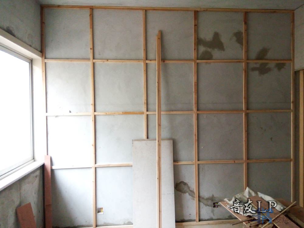 听音房有些正方形而且空间小,器材用电已经拉有两组专线后考虑空间增加容量,我打算在放沙发后墙做吸音处理来增加容量;在后墙3.2M×2.8M整面墙用2.5CM×2.5CM方木钉四方框,再用吸音材料填平,吸音材料用"木丝吸音板"2.5CM厚板.预想把声音吸收一部分来增加房间后墙的深度,也许能改善房的正方形问题.