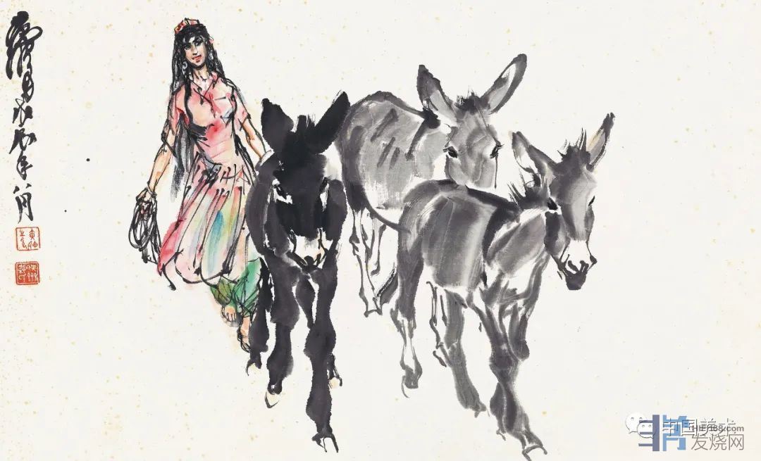 黄胄的新疆情我们都知道,齐白石擅长画虾,徐悲鸿擅长画马,而黄胄擅长画驴。驴是新疆等地的动物,它的作用主要是在运输方面,新疆人经常骑着毛驴去赶集。驴对耕田种地也有很大的作用。