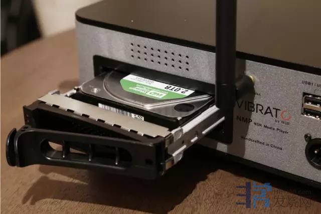 NMP作为数字硬盘播放器,最大的特点自然是内置硬盘,NMP背面具备一个硬盘仓,当中内置了一个WD2TB的硬盘(可以进行热插拔)。据官方表示,NMP最高可以支持高达8T的硬盘读取存储能力,对于打算购置家中数字音乐藏馆的朋友,NMP可能是你非常不错的选择。如果对于有朋友希望把硬盘谐振降到最低,亦可以换用SSD固态硬盘达到这一目标。而在一旁笔者还发现HDMI的接口,这个接口可以实现与电视显示的联动,把设备的菜单在显示设备上呈现,通过相应的遥控器进行可视化菜单操作。当然,如果嫌NMP只有一个硬盘仓,对于音乐容量爆棚的朋友,也可以通过机背后的网络接口实现与NAS硬盘进行访问。由于NMP内置了路由器,因此用户可以通过各类移动智能设备轻松访问。