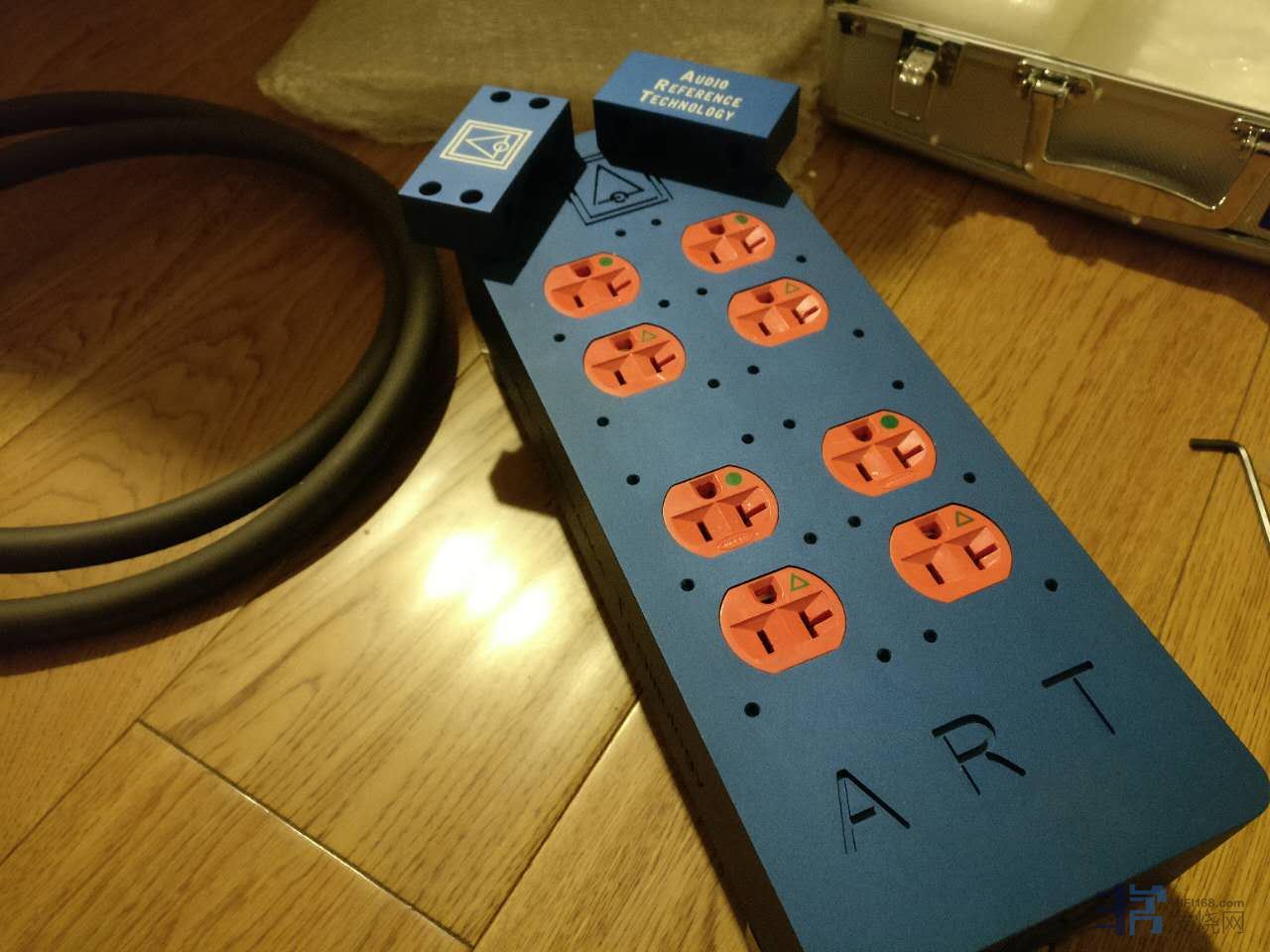 ART排插照例使用比较豪华的铝质锁箱包装,可实际还是要吐槽包装箱做工一般般,打开后分为排插主体部分、排插入口母座固定环两个和螺丝扳手 两大部分。小心拿出掂量,不大的体积却非常实沉,估摸着不下20斤,CNC工艺切割一体的圆滑精致做工,宝蓝外壳、橘黄插芯的养眼搭配应该让讲究颜值的外观党有不少满足感,比较用心的是排插底座四角均有螺丝锁紧的避震垫,底部较软,能跟地面保持有效接触。在避震方面,ART是特别讲究的,不仅有石墨垫、石墨唱片垫、唱片镇等,连排插也不放过,在排插入口母座和8位插孔上均有螺丝孔位,可供用户升级使用它专用的金属夹板,用来调节松紧固定插头,我想一是安全固定线材以免外力导致接触不良脱落,另外也是起到避震、屏蔽的效果,实际对比后发觉效果惊人。这次试听附送的有入口母座夹板和ART推荐用于总线功放的50A电源线,于是关于ART排插的试听对比就基本在这样的搭配使用下进行。