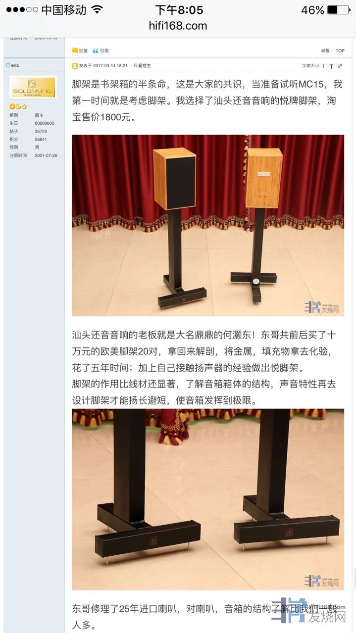之前我用的黑武士脚架声音总是发闷,音场打不开,总感觉功放的功率不够,后来在音箱下面放了脚钉,声音才改善了发过帖子
