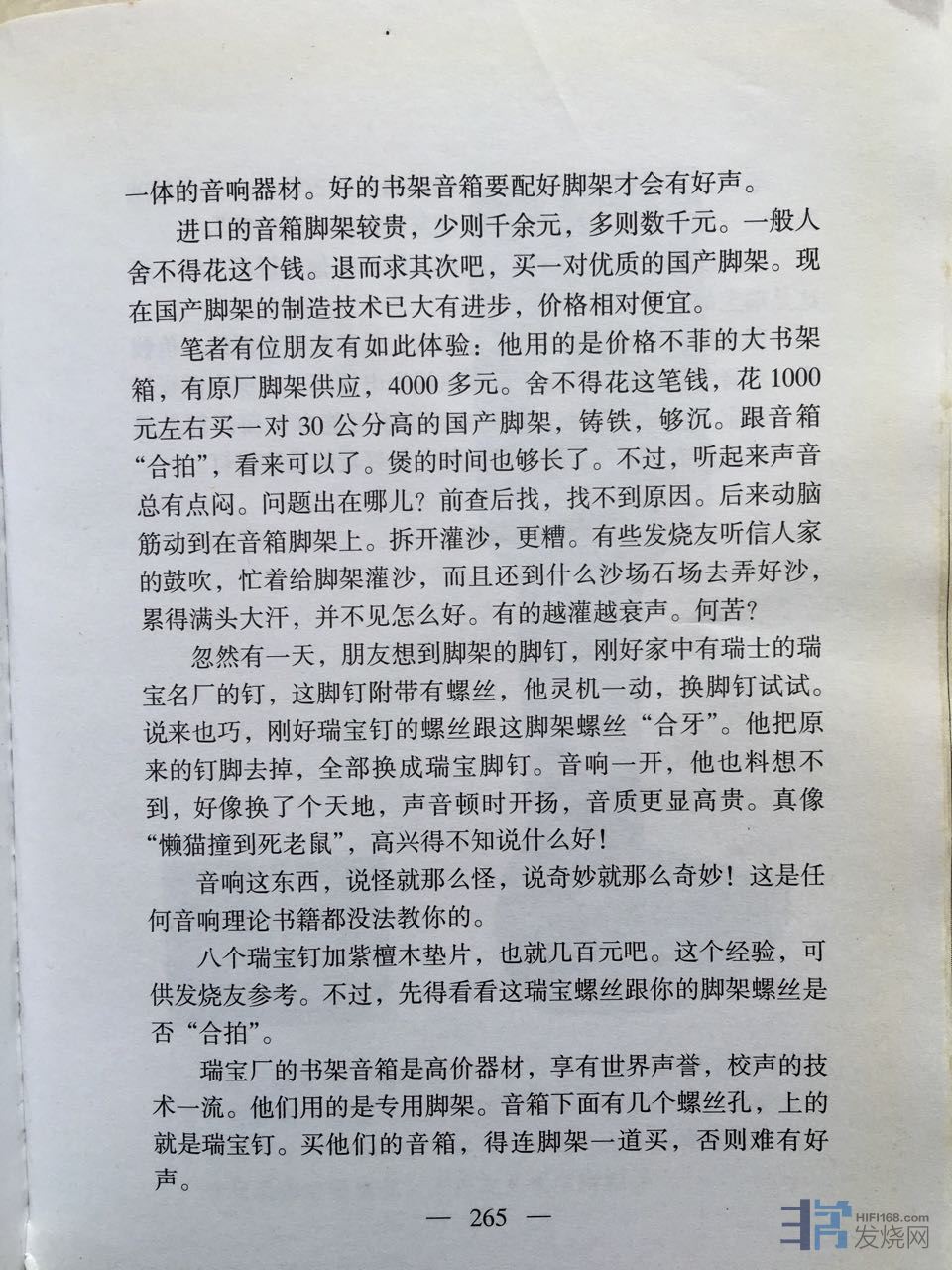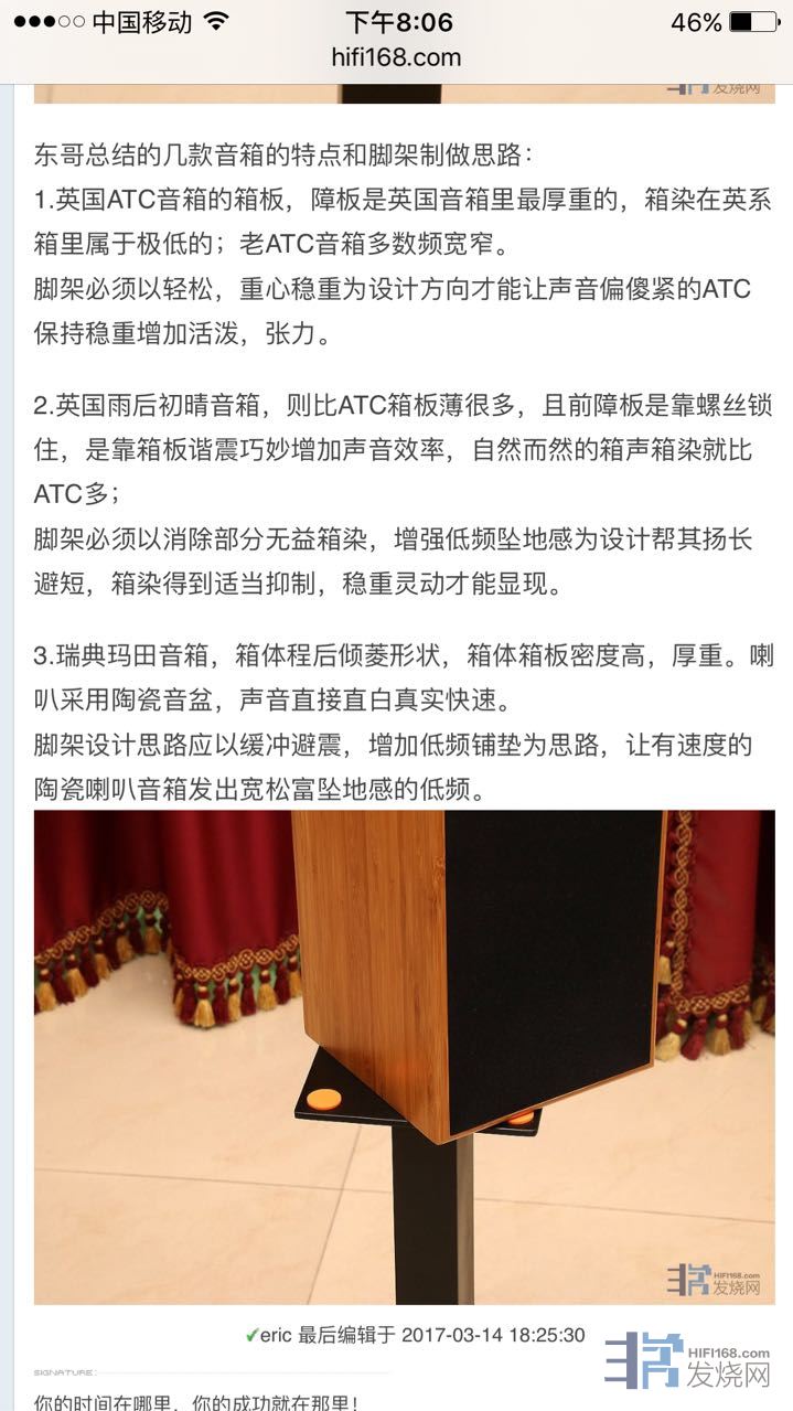 http://www.hifi168.com/bbs/showtopic-232798.aspx。这篇论文写到要树立这样的观点,脚架不只是垫材配件,是跟音箱连为一体的音响器材。这才是论文的精髓。那么我在音箱下放脚钉加脚架是属于垫材配件,要连为一体的音响器材,是不是要围绕着音箱去配制脚架,做一对和我的ATC11音箱设计理念合配的脚架。版主讲到悦牌脚架的几种音箱而不同的设计理念,与黑武士反复调换比试。以我的ATC11配制的悦牌脚架声最大的改变是低频下坠感明显,线条清晰。