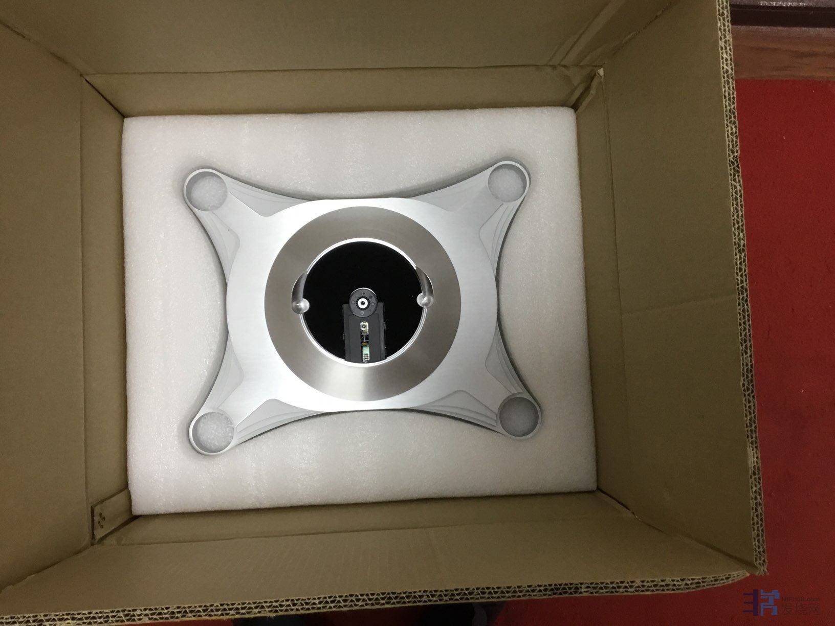 转盘部分是安置在一大块厚铝板上,然后用弹簧悬挂方式避震,简单实用。