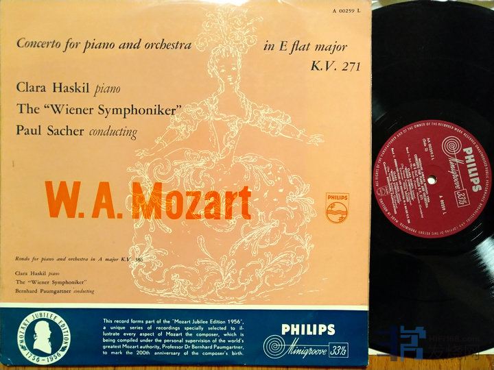 506 莫扎特:钢琴协奏曲K.271/回旋曲K.386等,哈斯基尔钢琴/萨克指挥维也纳交响乐团,PHILIPS荷兰Minigroove首版,只有单声道,EX+至NM-(一些发丝细痕),70元