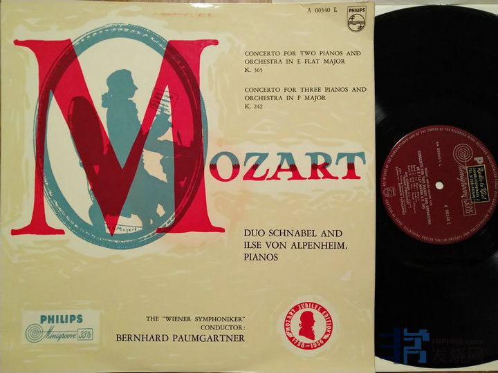 509 莫扎特:双钢琴协奏曲 K.365、K.242,施纳贝尔/阿尔佩海姆钢琴,保姆加特纳指挥维也纳交响乐团,PHILIPS荷兰Minigroove首版,只有单声道,EX++至NM-(几道发丝细痕),90元