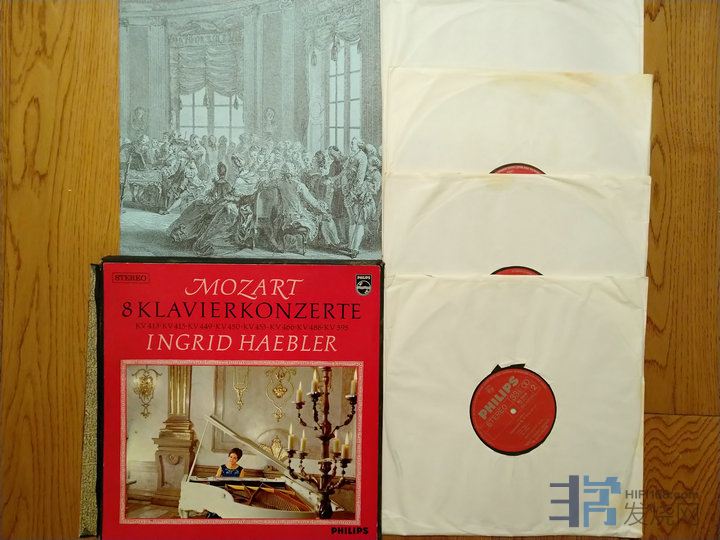 514 莫扎特:8首钢琴协奏曲KV413、KV415、KV449、KV450、KV453、KV466、KV488、KV595,海布勒钢琴/戴维斯指挥伦敦交响乐团,PHILIPS荷兰红银粗字首版,4LP早期布面盒装(侧面有破损),一面EX++(几道发丝细痕)其余NM-,290元