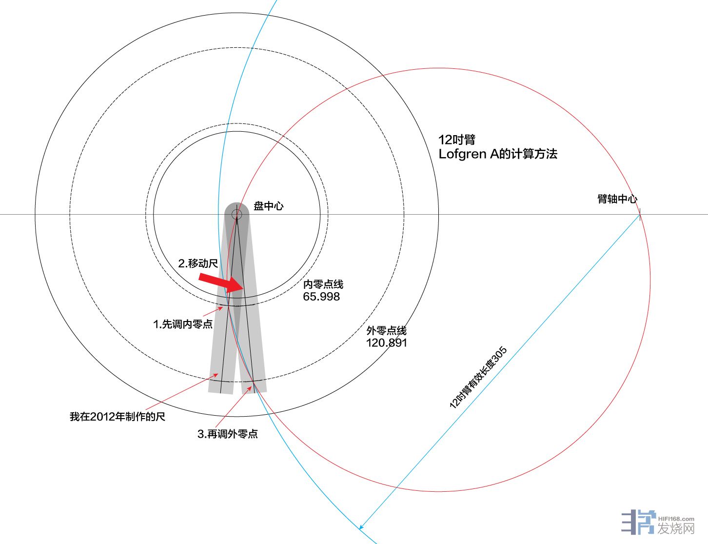 再看12吋臂,红色的圆形也与两个零点,盘中心,臂轴中心同时相交。