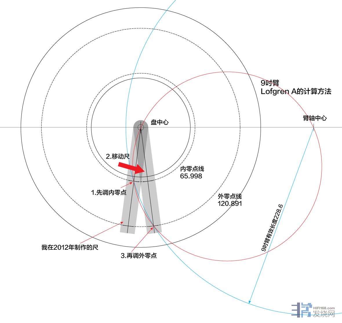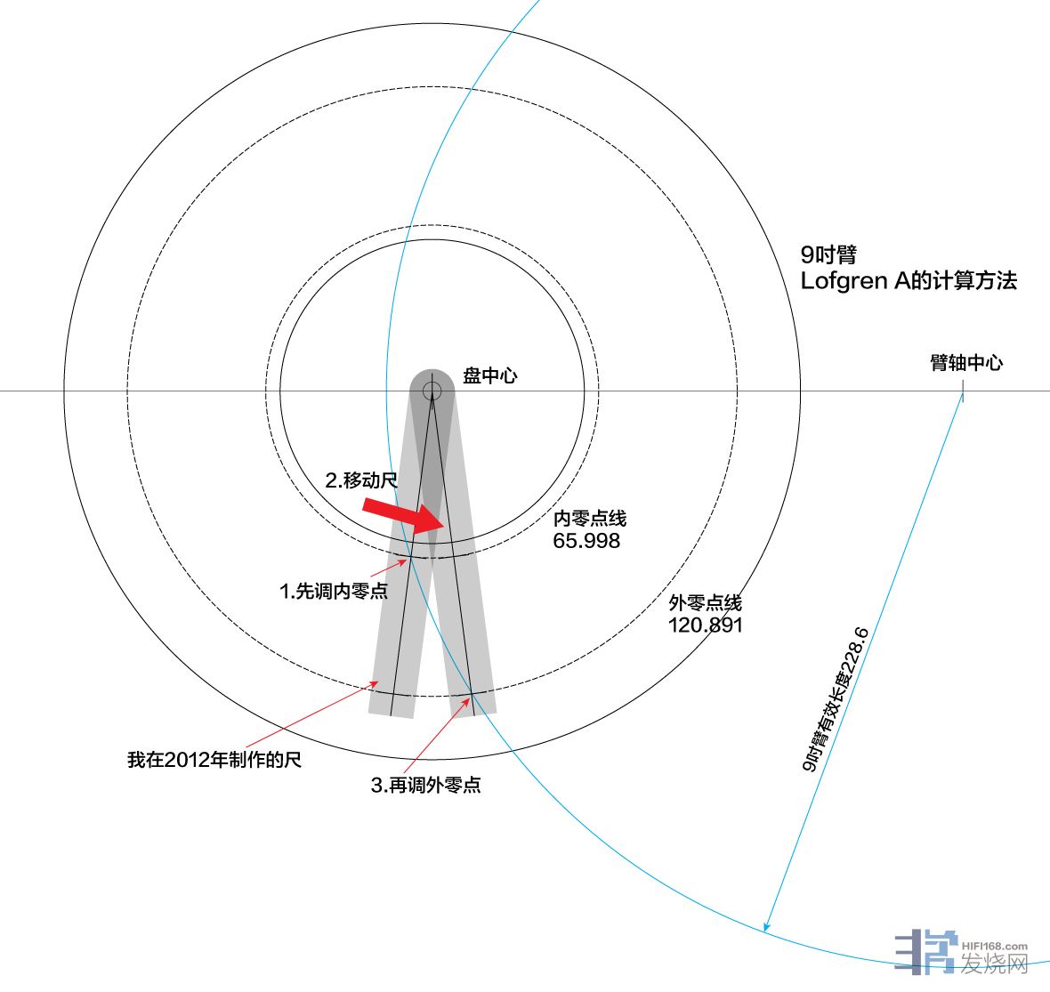 先画9吋臂。我用图表示出了运用这个尺的过程。首先调内零点。然后移动尺,再调外零点。假定这个尺是不能用的话,在外零点上,针杆就不会和盘中心成直角,和外零点线成切线。图中很明显地表示出在外零点上,这两个关系都得到满足。