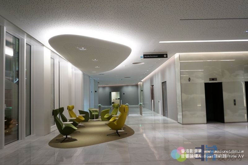 Devialet办公楼一楼大厅,请注意地上没有地毯,但天花板全部都是吸音设计,所以进入大厅很安静,我们的音响空间可以多学这样的做法。