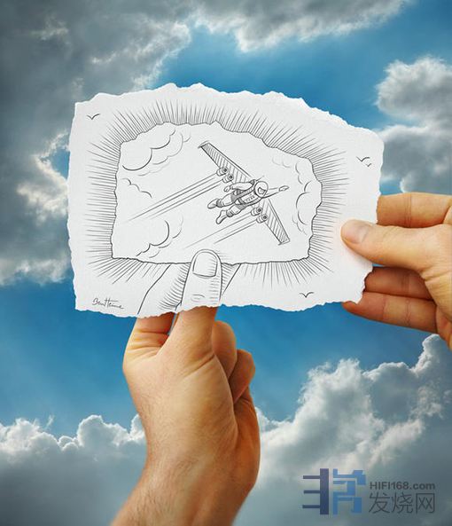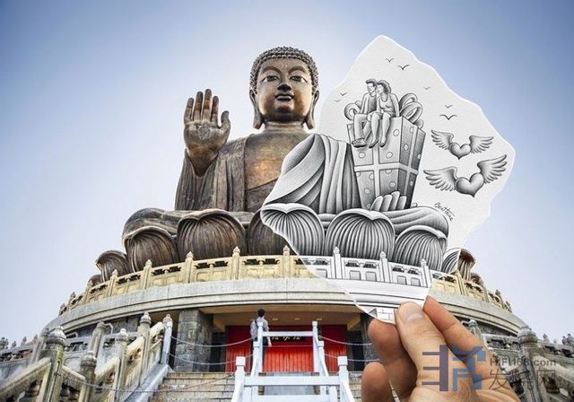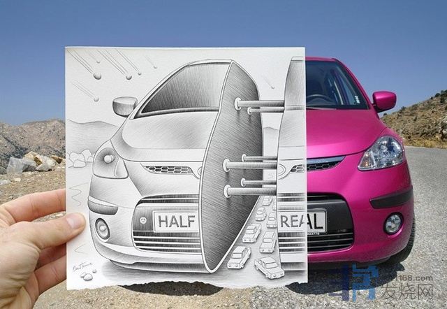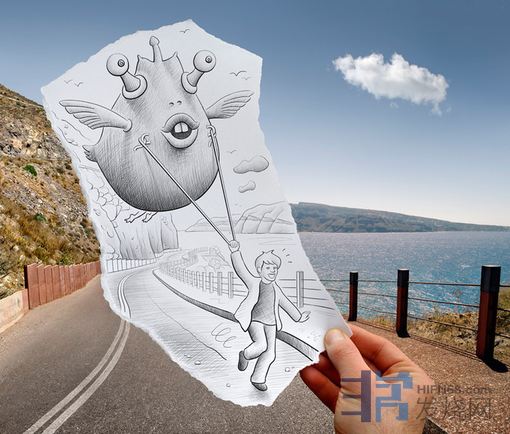 他在普通的相片中拼贴自己创作的3D铅笔画,两者结合勾勒出一幅幅脑洞大开的场景。