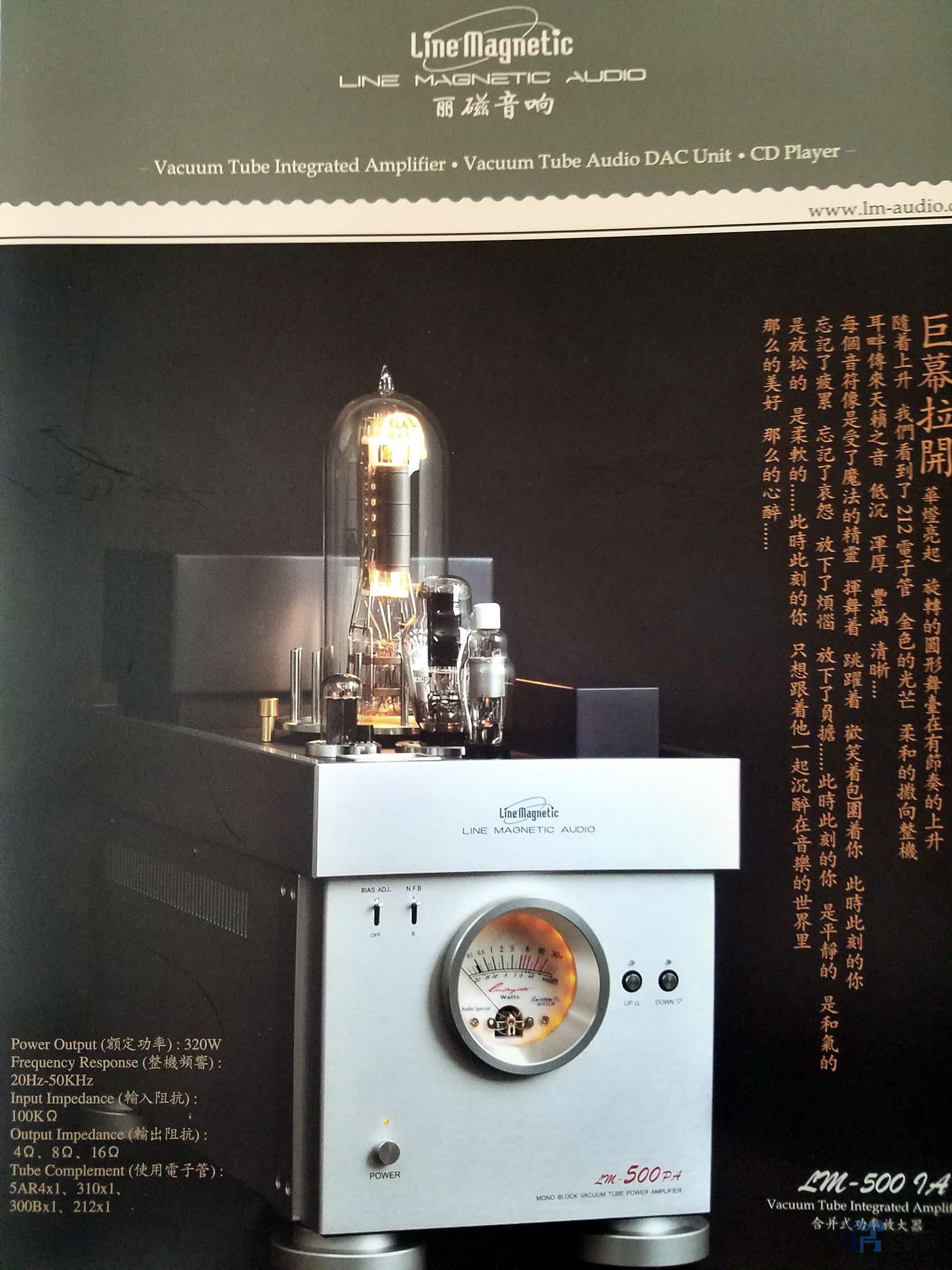 接下来试听了一张幻想曲2000的电影原声(反相录音),特别是第8首“火鸟”组曲,因为LM-500PA功率更大,所以震撼力更强,鼓声惊心动魄,但是也感受到声音有点粗,再听Russell Watson的《ENCORE》,确实能感受到比LM-508 IA推动时细腻度有所降低,看来功率越大,声音越粗这个规律在胆机上还是适用的。个人感觉300B的管子线性是最好的,声音也最美,但是做成单端的话,功率毕竟只有区区几瓦。