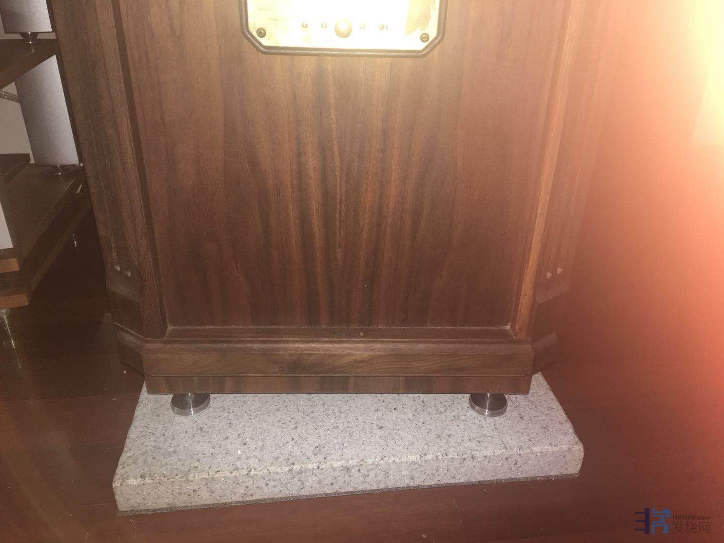 当初我是放于天朗贵族系列箱子下的,一方面是抬高高度,另一方面是避震效果,现替换了大理石,声音效果各有特点,根据个人喜好,成色95新,该避震厚木箱重量有10公斤左右,面子上有少许划痕,是放箱子脚钉留下的,尺寸:50×40×10cm.出售价格1000元。联系电话:13901608831.当初买避震厚木箱,咨询大昌公司的工作人员,它的结构是有三层厚度2.5公分的实木加上黑金沙做成的,外面用胡桃木贴皮。音箱放在该避震厚木盒子上后,低音结实。