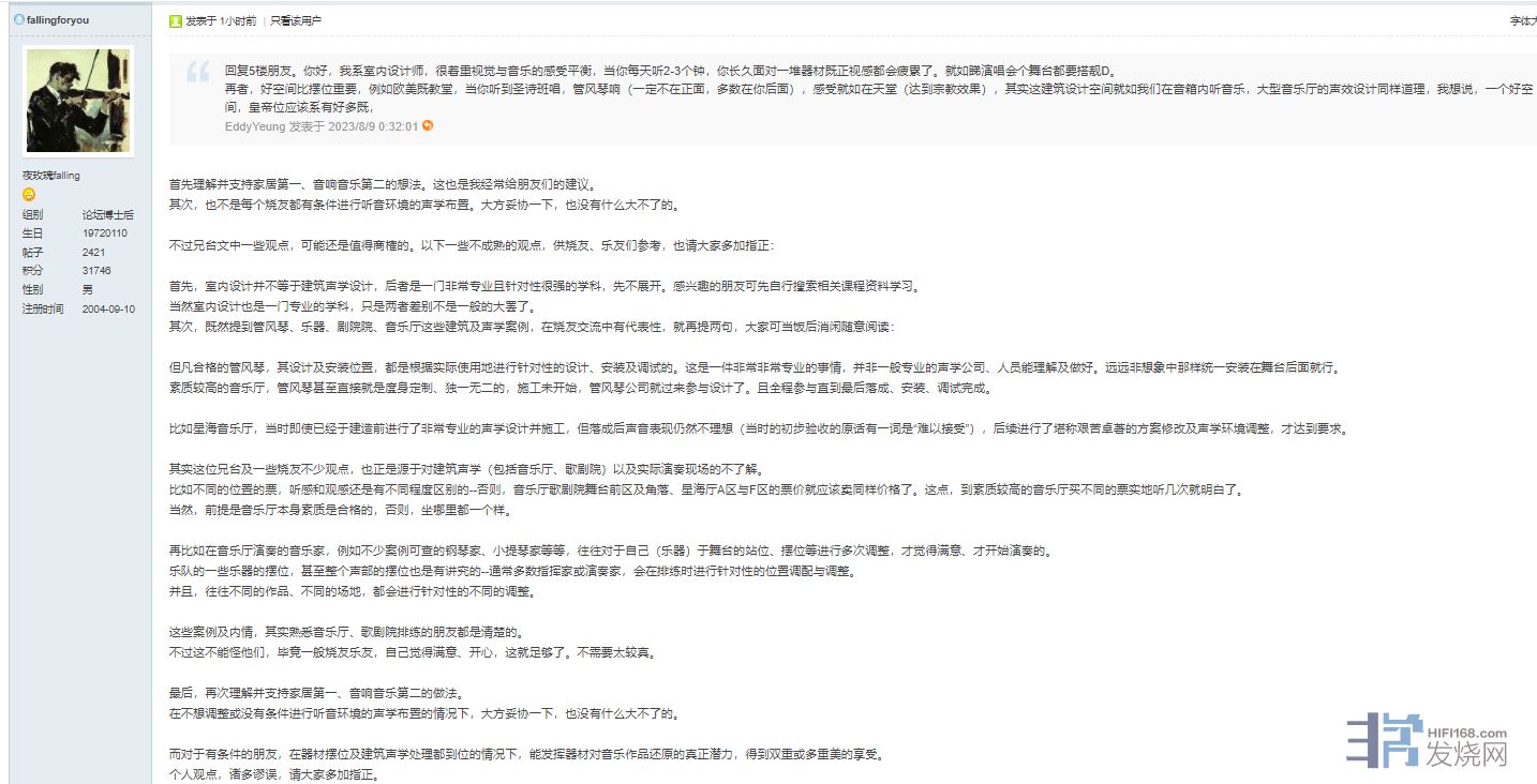 刚才我对一位坛友回复内容里,有涉及声学环境及音乐厅现场的一些比较有意思而行外人较少知晓的知识,有一定代表性,我截图放到这里存档备查。