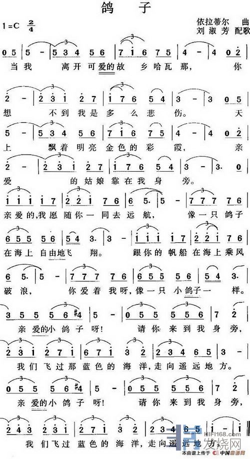 《鸽子》(La paloma),是一首由原籍西班牙的作曲家塞巴斯第安•伊拉迭埃尔 (Sebastian Yradier,1809-1865)长期旅居古巴,并在古巴用古巴的“哈吧涅拉”风格写的舞曲,后来由墨西哥著名女歌手贡恰•孟德丝于1863首演后流行,“哈巴涅拉”的特点是始终采用二拍子的摇摆节奏,节奏型和阿根廷探戈完全一样,因此后人演唱或演奏时往往将其作为探戈曲处理。归根结底,这还是一首古巴风格的舞曲。虽然出于西班牙作曲家之手,流行于墨西哥歌手之口,演变于阿根廷探戈的节奏。《鸽子》诞生于十九世纪,至今仍然被当成民歌,在世界各地广为传唱。由于写得很好,流传甚广甚长,有几个国家的人都争着把它说成是自己本国的民歌,并以拥有它而感到光彩。