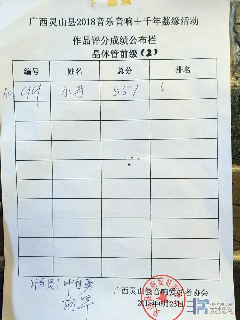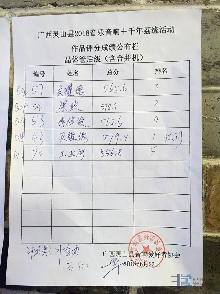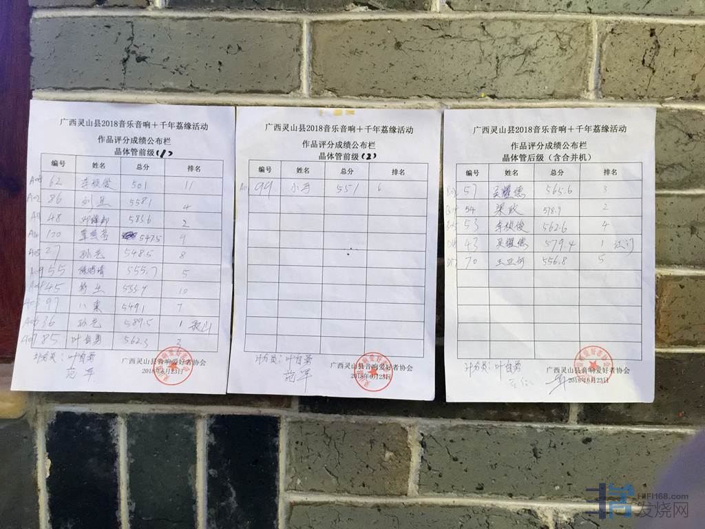 40台机器包括胆前级,胆后级,晶体管前级,晶体管后级,合并机。都要先捡测正常才能参加比较。播放四首曲目,十二大评委评分。整整从早上9.30分比到下午6.30分才正式完成,我有幸参加了,发现评委他们辛苦坚持了一天,不得不佩服烧友的心态。