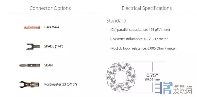 在接头方面,12VS有着丰富的选择,例如SPADE(1/4英寸)叉形接头、SBAN香蕉接头以及Postmaster 33(5/16英寸)叉形接头等。另外12VS整体的线材粗壮程度也给了具体的规格约为0.75英寸。