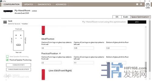 LINN的空间优化可以完善地解决这个状况,当我们第一步将音箱先摆放在最佳位置时,已经将信息都输入至软件当中,并将运算结果记忆起来,此时我们更动音箱到别的位置上,软件将能够再次进行计算调整,让声音就如同在最佳位置上的效果。先看看照片我示范时位置的不同。