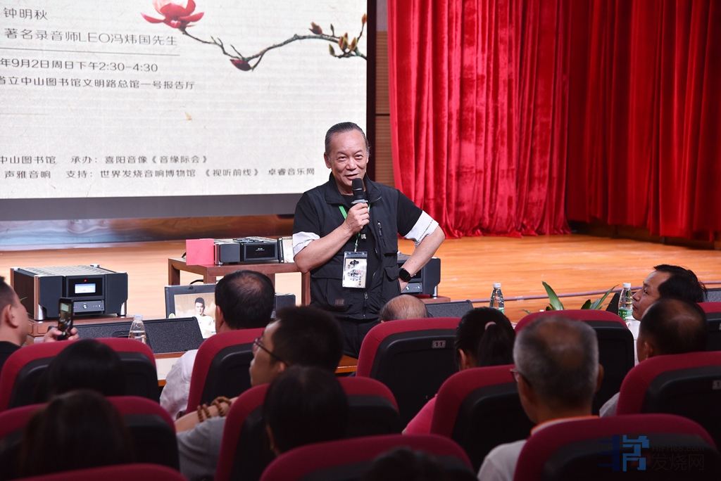 二点三十分主持冯大哥感谢冒雨到场的各位后,先是通过音响播放了刘嘉佳的《往日时光》专辑中的《矜持》和《绒花》。瞬时间全场在热烈的掌声中静下来,只听得刘嘉佳在“矜持”中扣人心弦的清唱和翠色点点的钢琴在空间弥漫,饱满温暖的人声,颗粒透亮晶莹的钢琴,正轻松地重现在这有12米高、400平米大,有逾三百席位的省立中山图书馆一号报告厅之巨大空间。作为负责播放的音响是“声雅”提供的:CD机3.5,前级CV1,分体后级300T(300W8Ω)和丹拿喇叭C4,正是这么一套“平民级”的音响,在这大空间,还有满满的数百人之众的环境中依然重播得气度盎然、从容不迫。这与器材质素之高当然功不可没,同时也和这报告厅之声学条件以及冯大哥调校功力息息相关也。目睹如斯音效笔者询问在旁之声雅何总,答曰:这前后级是几万元入门级的机种而矣。