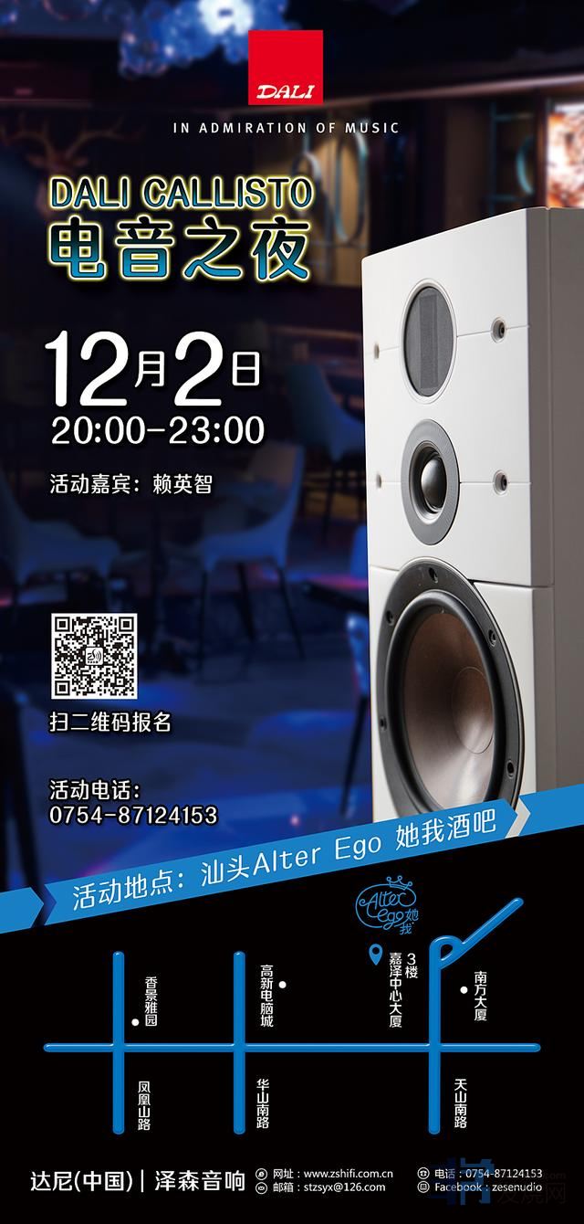[p=28, null, left]就在35周年庆这个值得纪念的特殊年份,DALI发布一系列非常重要且有着里程碑式意义的新产品,而 CALLISTO(天音)系列音响系统就是其中之一。12月2日晚,DALI达尼(中国)将携手泽森音响于汕头“Alter Ego 她我酒吧”举办“DALI CALLISTO电音之夜”主题派对,活动有幸请来《新音响》主编赖英智先生作DALI CALLISTO天音系列发布。盛邀潮汕三市的烧友齐聚,共同品赏!