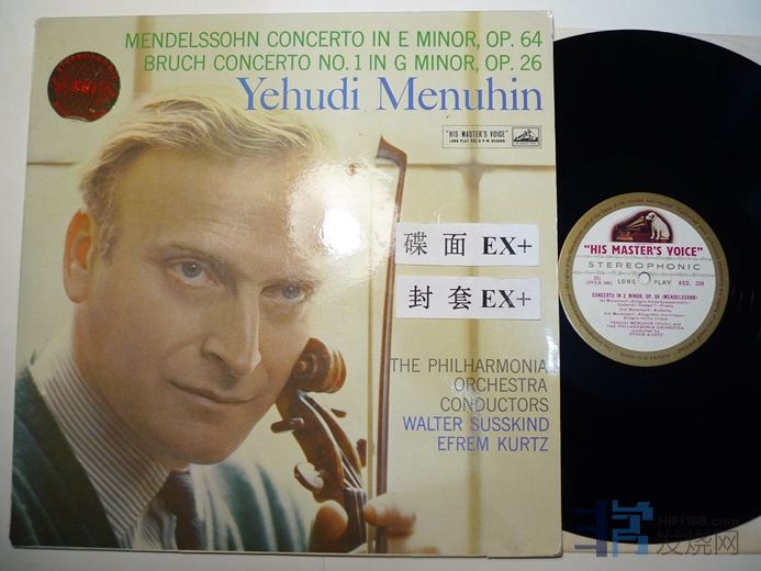 梅纽因演奏门德尔松小提琴协奏曲,布鲁赫第一小提琴协奏曲,EMI白金狗,英国压片,碟面有些表面细纹,门小协播放比较安静,布小协有点很轻微的底噪,主要是在前一半,240块