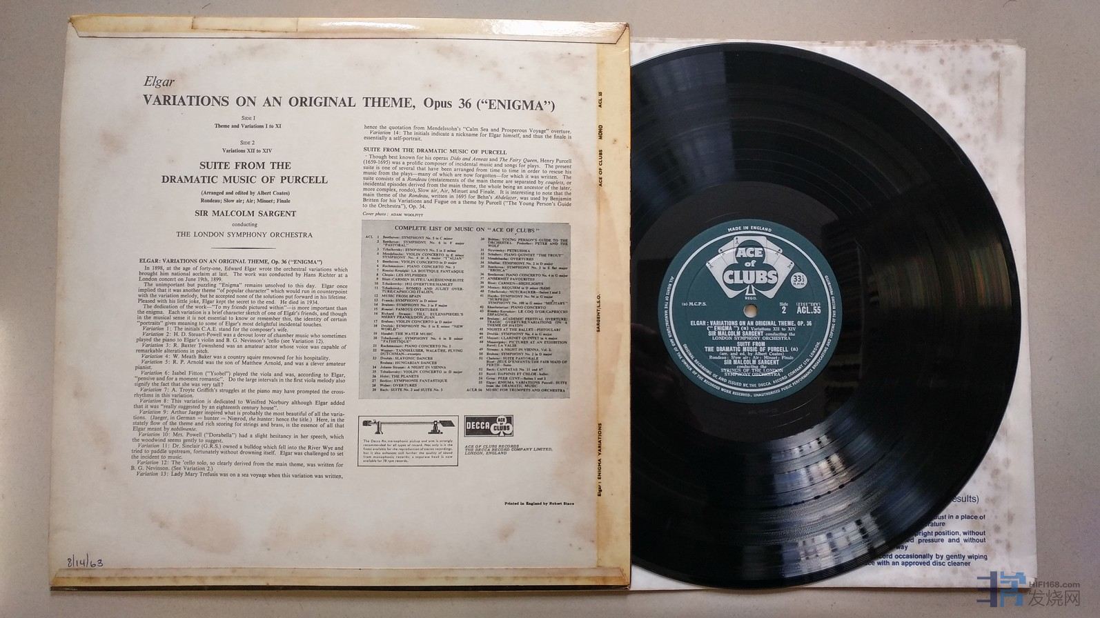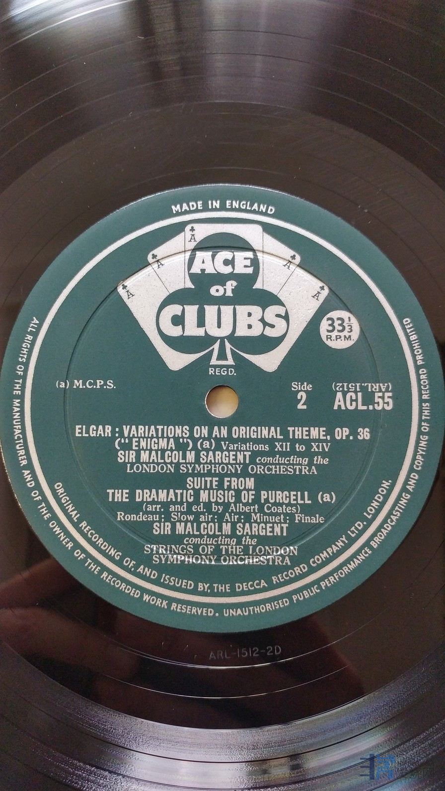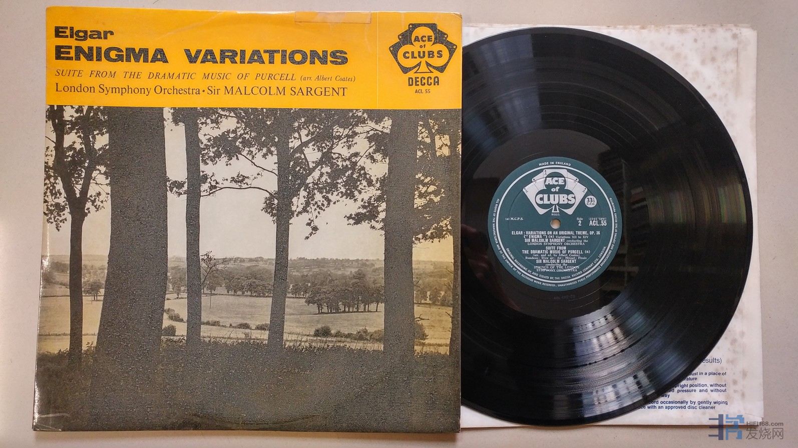 沙金爵士 指挥伦敦交响乐团《艾尔加 迷的变奏曲,珀塞尔 戏剧音乐组曲》,英国DECCA单声道,ACE of CLUBS厚盘头版,唱片NM-,50元