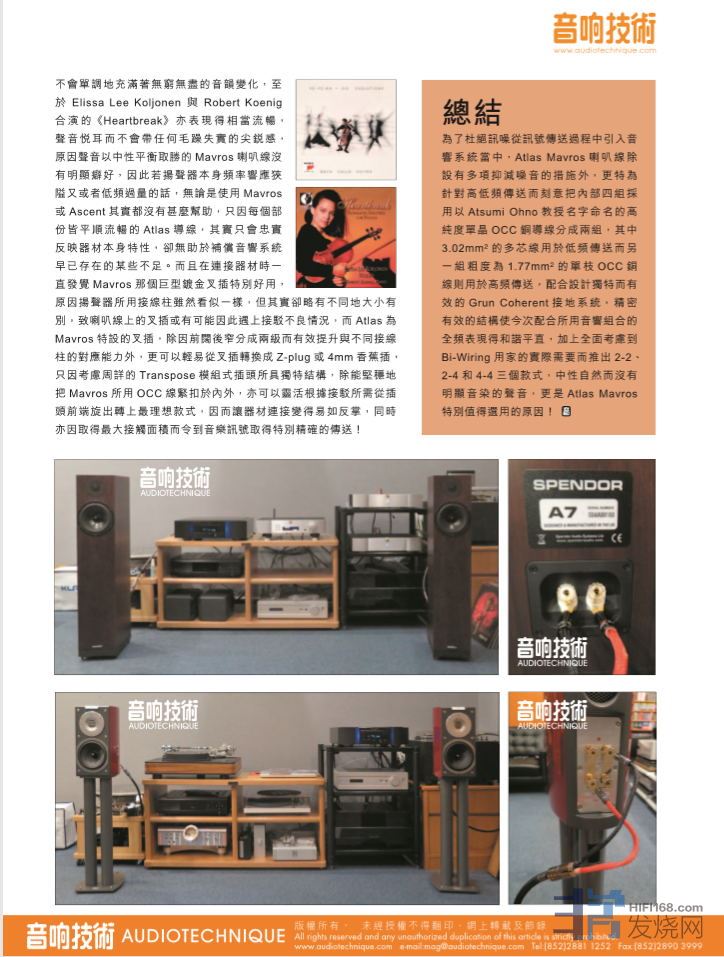 分别检测Mavros和同样使用0CC钝铜制作的Ascent 3.5 MK II唰叭线后,发觉两者的讯号传送效能相当不俗,其中又以备有Grun Coherent接地而制作得特别严谌的Mavros更显出色,配合不同类型播声器使用,当中以配合Spendor A7和 Audiovector SR1 Avantgarde 时显得最是合拍,能够把Spendor A7所具频应宽阔而声音清劲有力的重播效果,不加不减地如实表现出来,同时也使Audiovector SR1 Avantgarde清丽脱俗的迷人声效获得理想反映|如此组合重播多种不同类型的音乐皆表现出色。