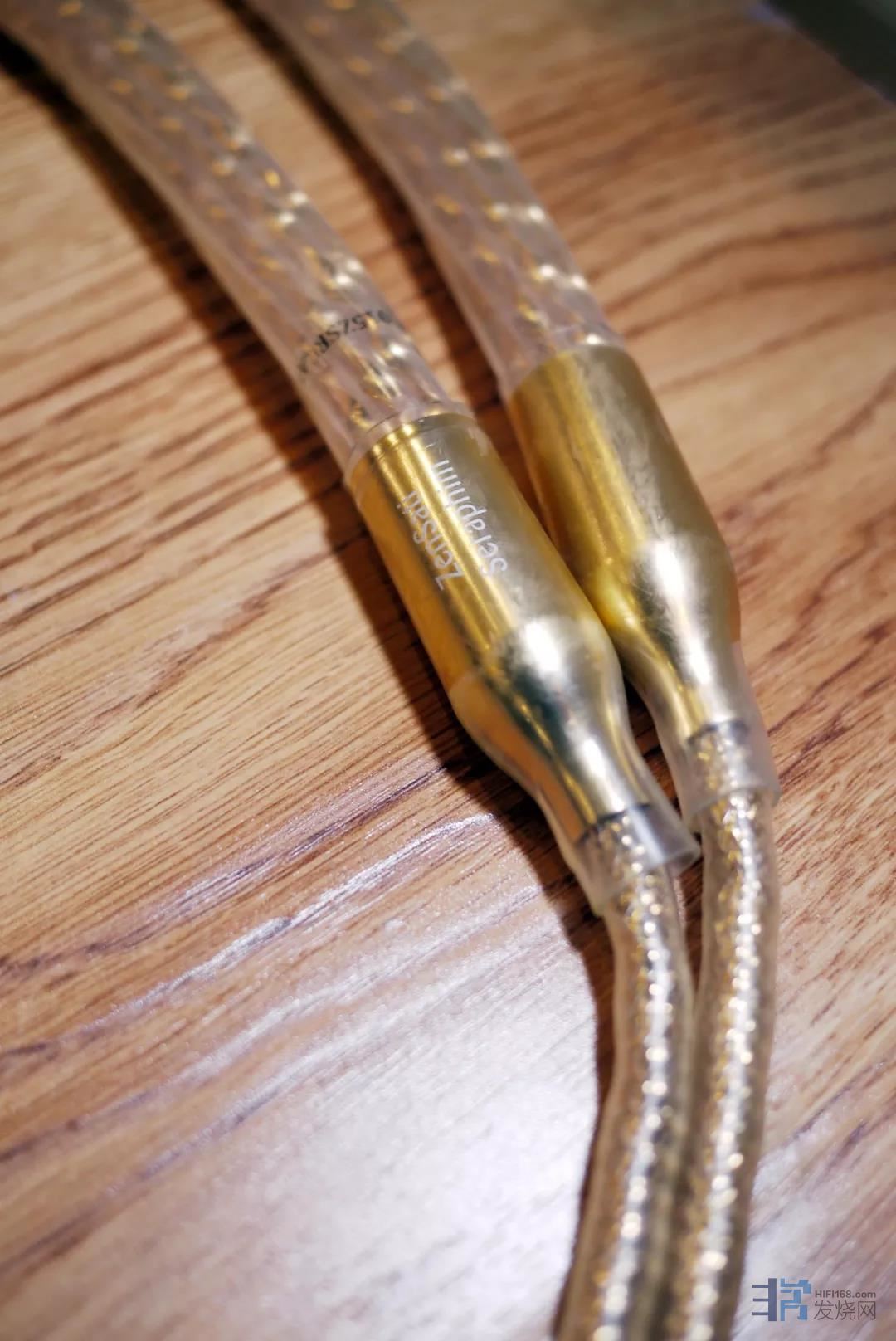 ZenSati的CEO兼创始人Mark Johansen先生的设计理念认为要达到最低的音染,获得最佳的声音,其最佳的连接方式就是器材与器材之间直接连通,因此他的理念就是尽可能的低失真、低损失和高速传输。旗舰的Seraphim炽天使采用透明FEP绝缘导管,清晰可见内部金光闪闪的螺旋扭曲扁平状导体,其实这是由七组相互绝缘的导体以特定的间隔距离螺旋排列而来。此设计的目的可解决导体的肌肤效应,并且获得趋近于空气绝缘的极低电介质效果(螺旋扁平导体在绝缘管中的接触面积非常有限),还在保证充裕的导体截面积的基础上获得适中的线身柔软度,避免线材过于硬朗难以使用。线身两端使用的RCA插头同样采用镀金处理,因此整条线外观金碧辉煌,非常贵气。