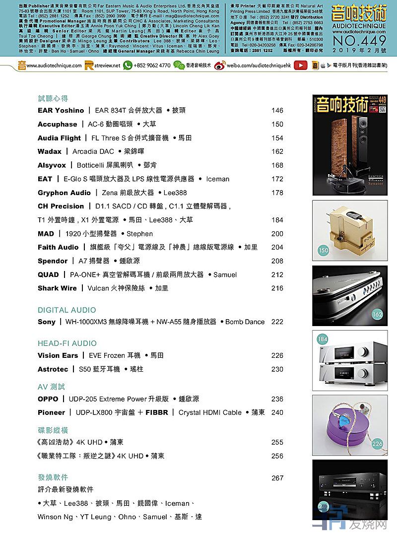 今期封面专题由锺启源、加里评论Duntech Senator Signature扬声器,草言草语 : 胆迷至爱 WE 300B强势回归,其他评论文章包括:EAR Yoshino EAR 834T合并放大器、 Accuphase AC-6动圈唱头、Audia Flight FL Three S合并式扩音机  Wadax Arcadia DACAlsyvox Botticelli 屏风喇叭、EAT E-Glo S唱头放大器及LPS线性电源供应器  Gryphon Audio Zena前级放大器  CH Precision D1.1 SACD / CD 转盘, C1.1 立体声译码器, T1 外置时钟 , X1 外置电源 MAD 1920小型扬声器、Faith Audio 旗舰级「夸父」电源线及「神农」总线版电源线 Spendor A7扬声器、QUAD PA-ONE+真空管译码耳机/前级两用放大器 Sony WH-1000XM3无线降噪耳机 + NW-A55随身播放器、Vision Ears EVE Frozen耳机、 OPPO UDP-205 Extreme Power升级版 Pioneer UDP-LX800 宇宙盘 +FIBBR Crystal HDMI Cable  ....,详细内容请参阅目录。