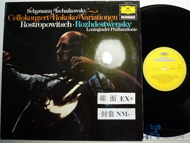罗斯特罗波维奇演奏舒曼大提琴协奏曲,柴可夫斯基“洛可可主题变奏曲”,DG德国压片,第一面有条细纹,经过有很轻微的“哒”声,80块