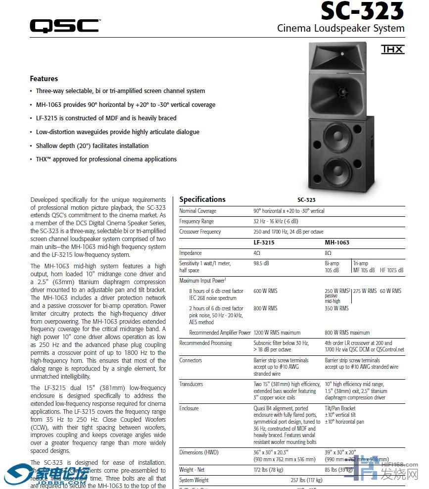 SC-323是专为满足专业电影还音要求设计的,扩展了QSC DSC数字影院扬声器系统的产品线。SC-323是可选择双路或三路驱动的三分频电影主声道扬声器,由中高频单元MH-1063和低频单元LF-3215组成。