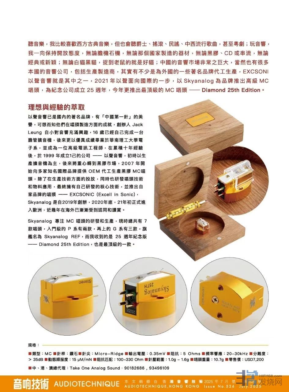 香港《音响技术》杂志对以声出口品牌Skyanalog 25周年MC唱头的评测!