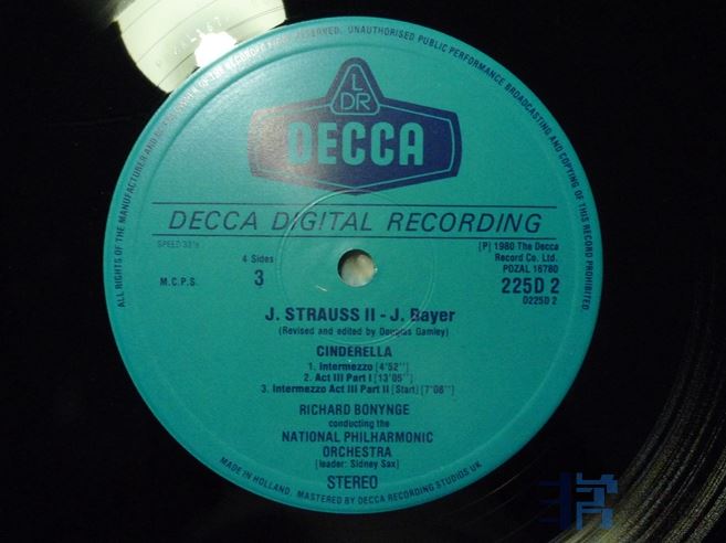 波宁吉指挥约翰.施特劳斯《灰姑娘》,DECCA数码录音,荷兰压片,盒装两张,音效很好,第三面有条1厘米的划痕,如图,其余NM,150块