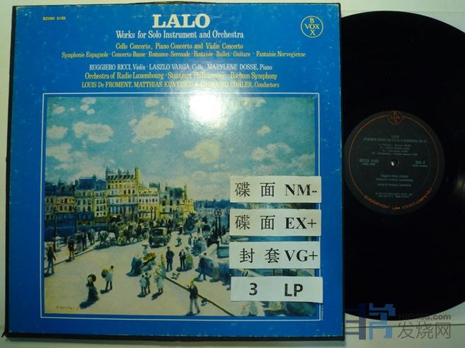 里奇演奏拉罗“西班牙交响曲”Op21、小提琴协奏曲Op20、Op28、Op29、浪漫小夜曲,芭蕾幻想曲,瓦尔加演奏拉罗大提琴协奏曲,多斯演奏拉罗F小调钢琴协奏曲,VOX美国压片,盒装三张,180块