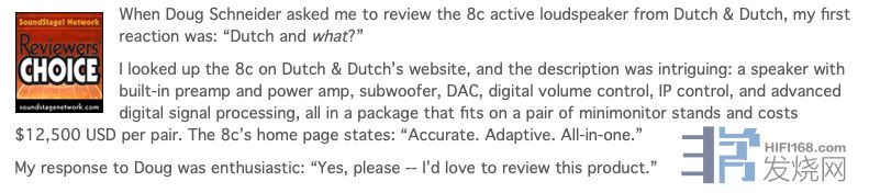 When Doug Schneider asked me to review the 8c active loudspeaker from Dutch & Dutch, my first reaction was: “Dutch and what?”