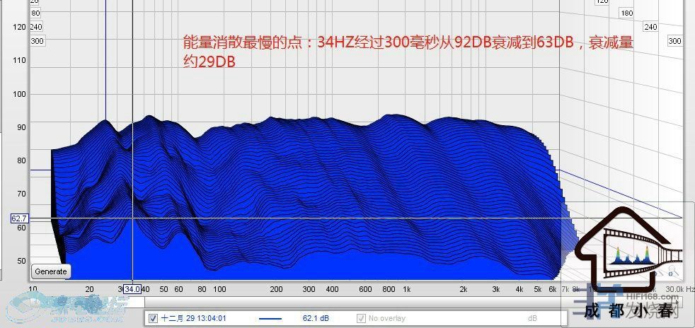 对于小空间声学来说,因为受空间RoomMode的影响,可能超低频会起伏比较大,所以一般不用混响时间来量化,而是改为时域上的能量消散图来更为确切,有什么用呢?