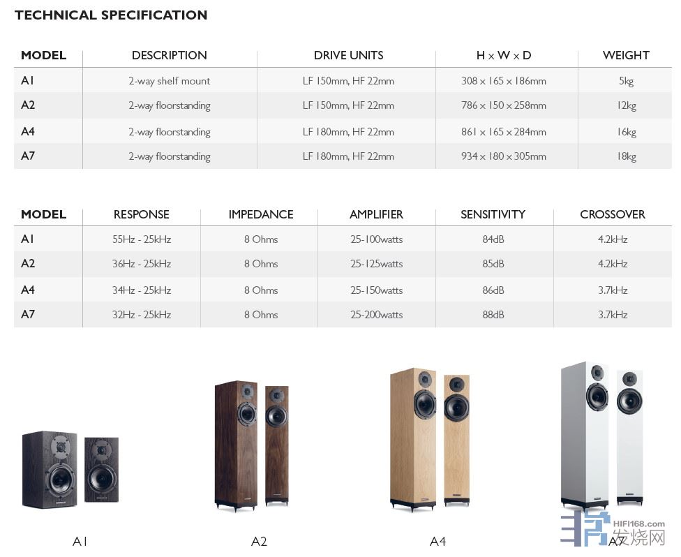 A-LINE系列目前共有A1书架音箱、A2、A4与A7落地音箱四款,均使用一样一颗22mm的半球型高音,可到25kHz,低音单体A1与A2相同为150mm,A$与与A7相同为180mm,最低可到32Hz,阻抗均为8欧姆,效率分别为84dB, 85dB, 86dB与88dB,越大对效率越高。外观有炭黑、樱桃木与深核桃、沙丁白四种可选,所有的Spendor音箱都在英国自家的工厂设计生产。