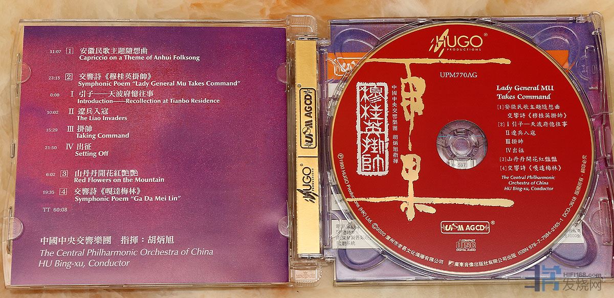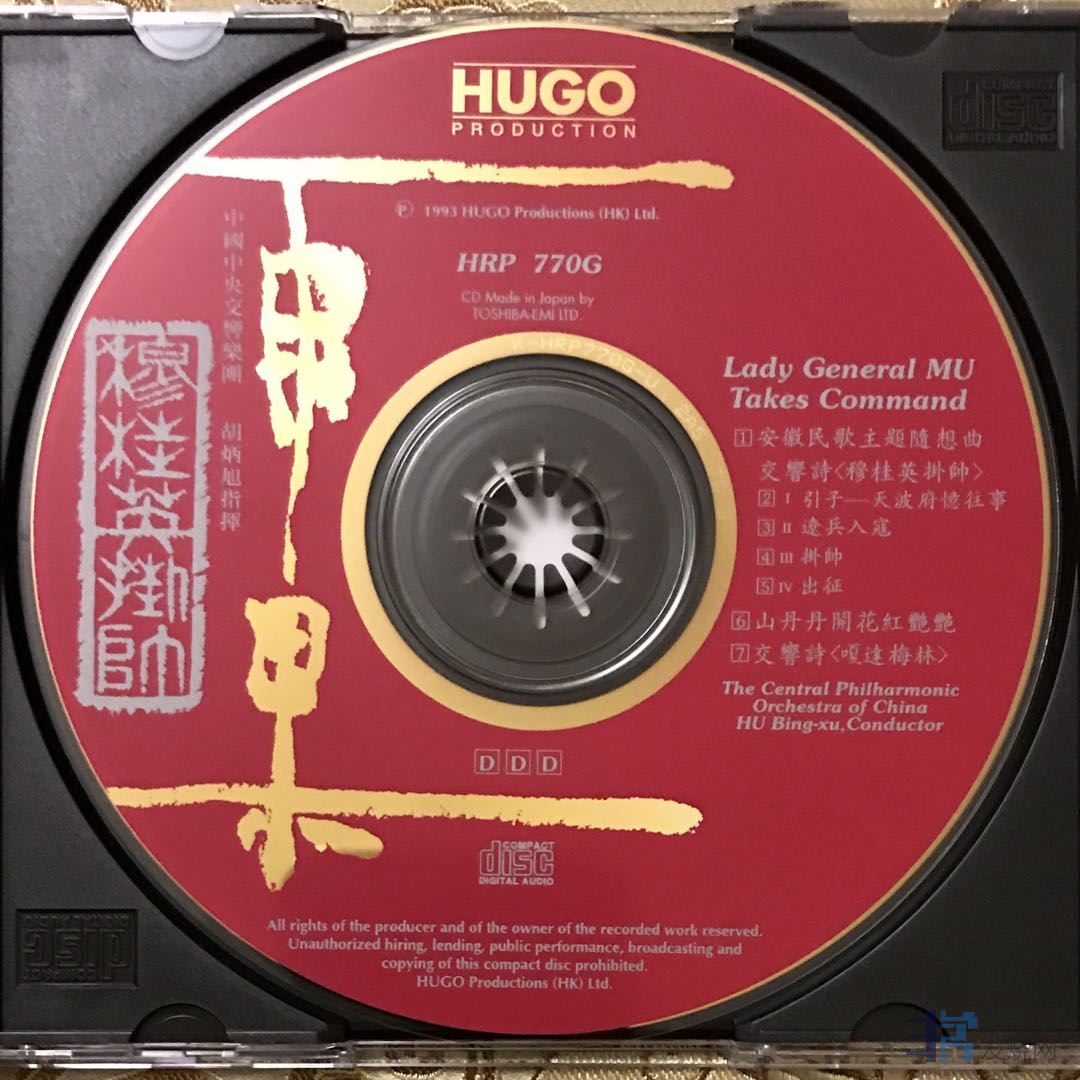 雨果录制于1992年9月的《中国管弦乐及小品系列-穆桂英挂帅》是一张非常经典的发烧唱片,其头版碟在淘宝被炒到450元,24K金碟被炒到750元。