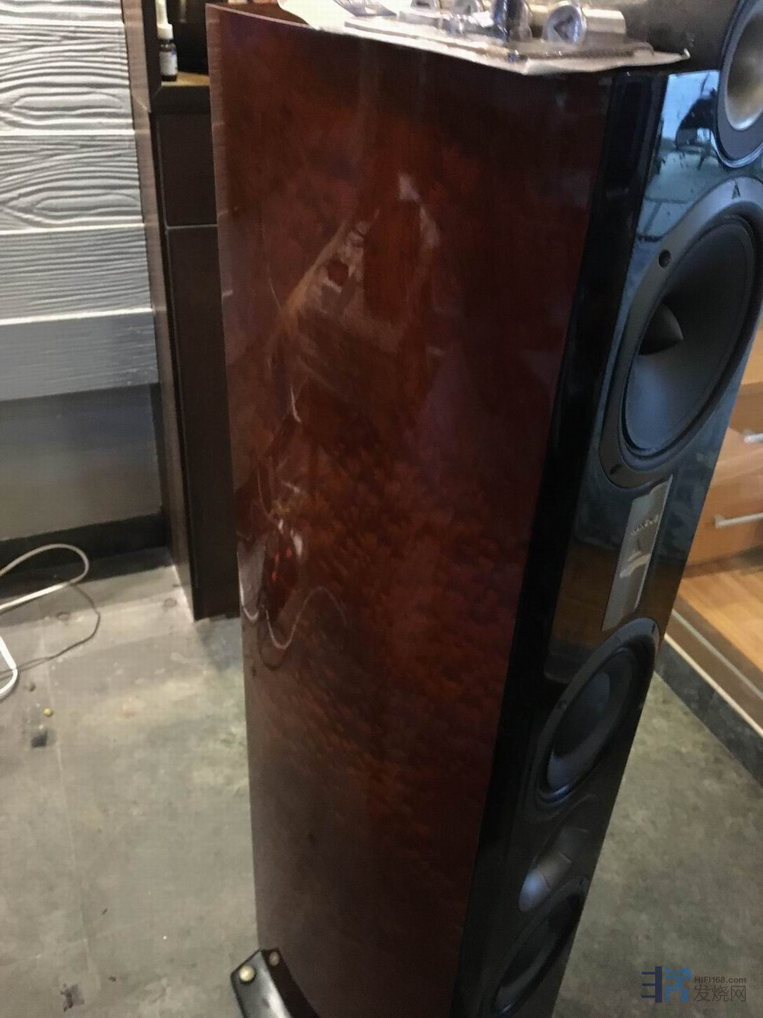 音箱是朋友的,一直闲置,饰面是当年他买的时候找法国人定制的沙比利木皮钢琴漆,比市面上通货版本饰面漂亮非常多